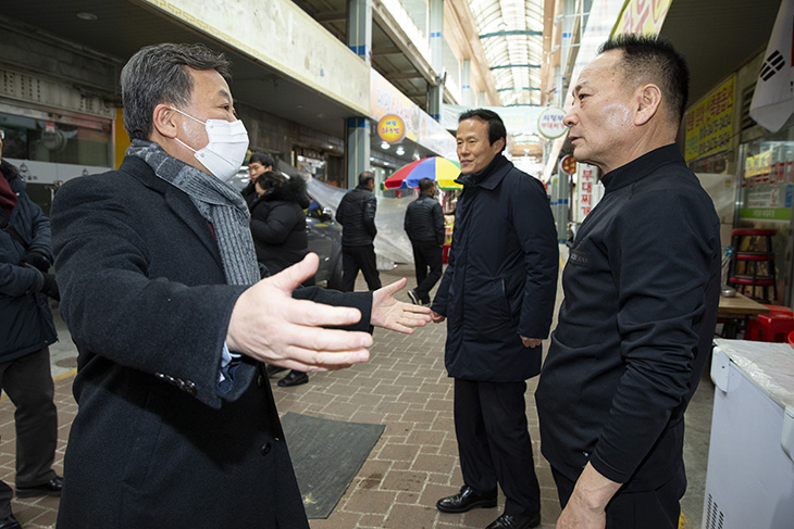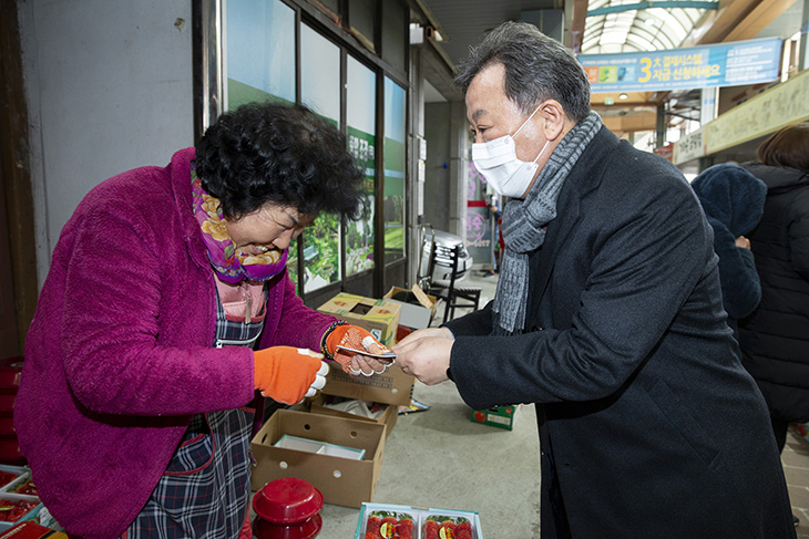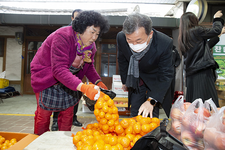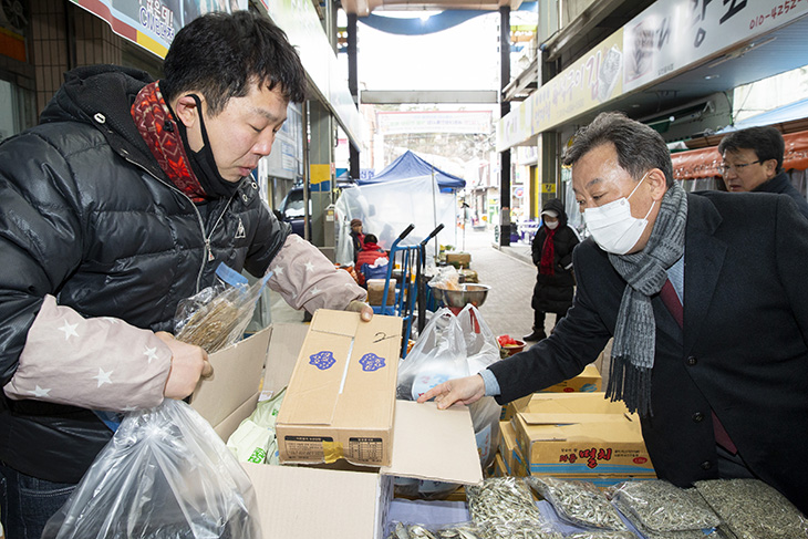 최근 신종 코로나바이러스 감염증(코로나19)로 위축된 지역경제에 도움이 되고자 17일 오후 황서종 인사혁신처장이 세종시 금남면에 위치한 대평시장을 방문해 과일과 건어물 등을 구입하고 있다. 이 날 구입한 음식들은 세종시 부강면에 위치한 지역아동센터에 전달되었다.