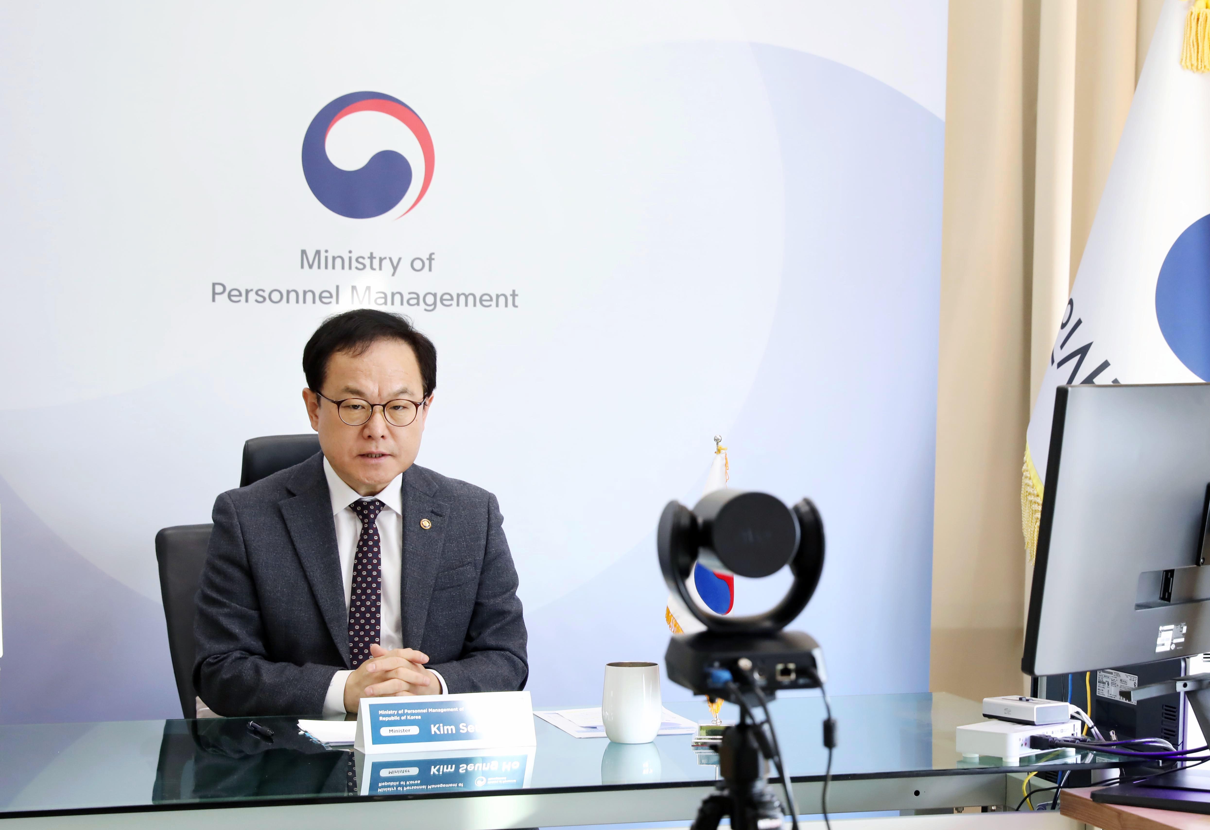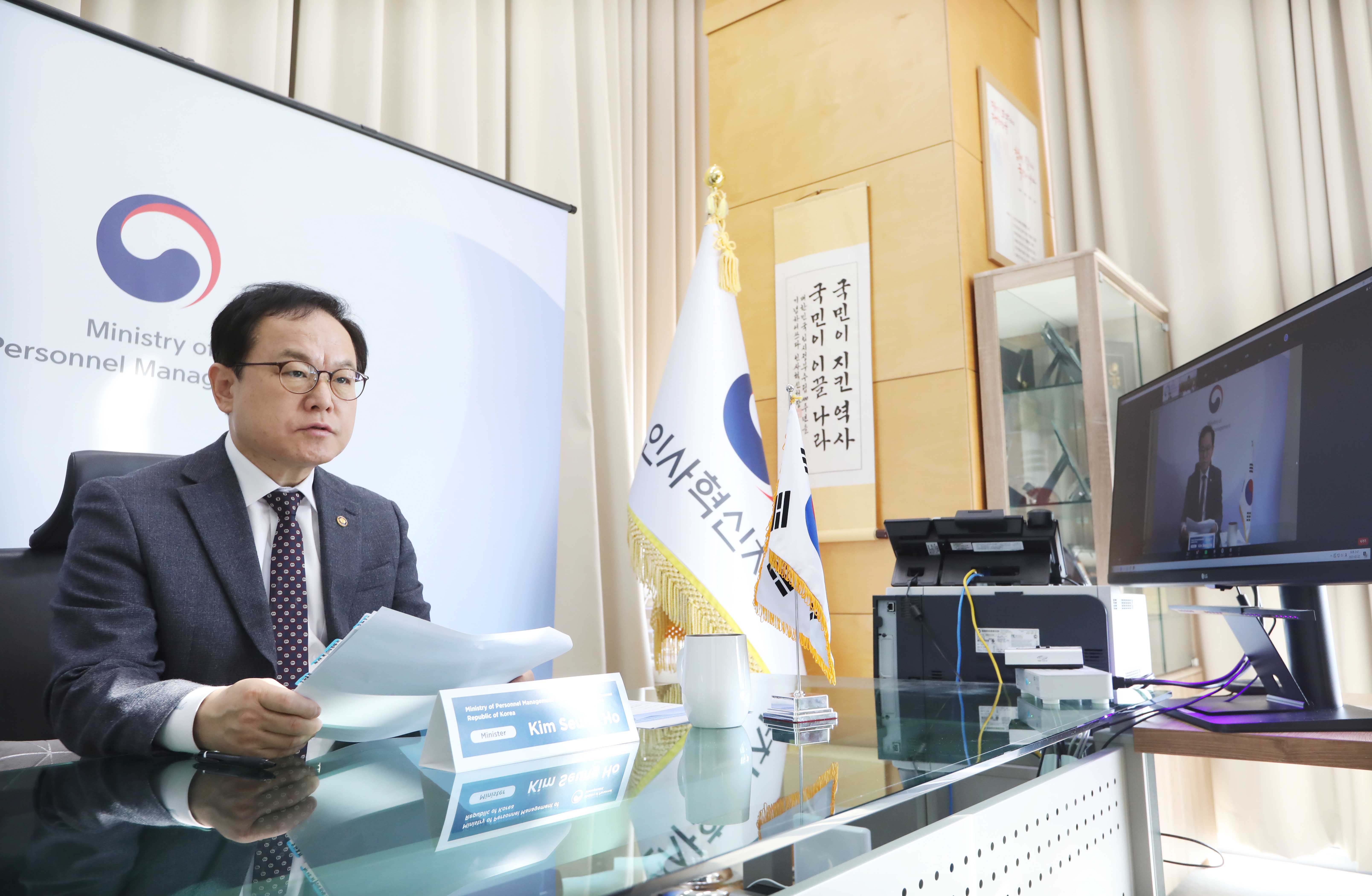 김승호 인사혁신처장이 2월 22일 세종시 인사처에서 온라인으로 열린 '제9회 한중일 인사장관회의'에서 개회사를 하고 있다.