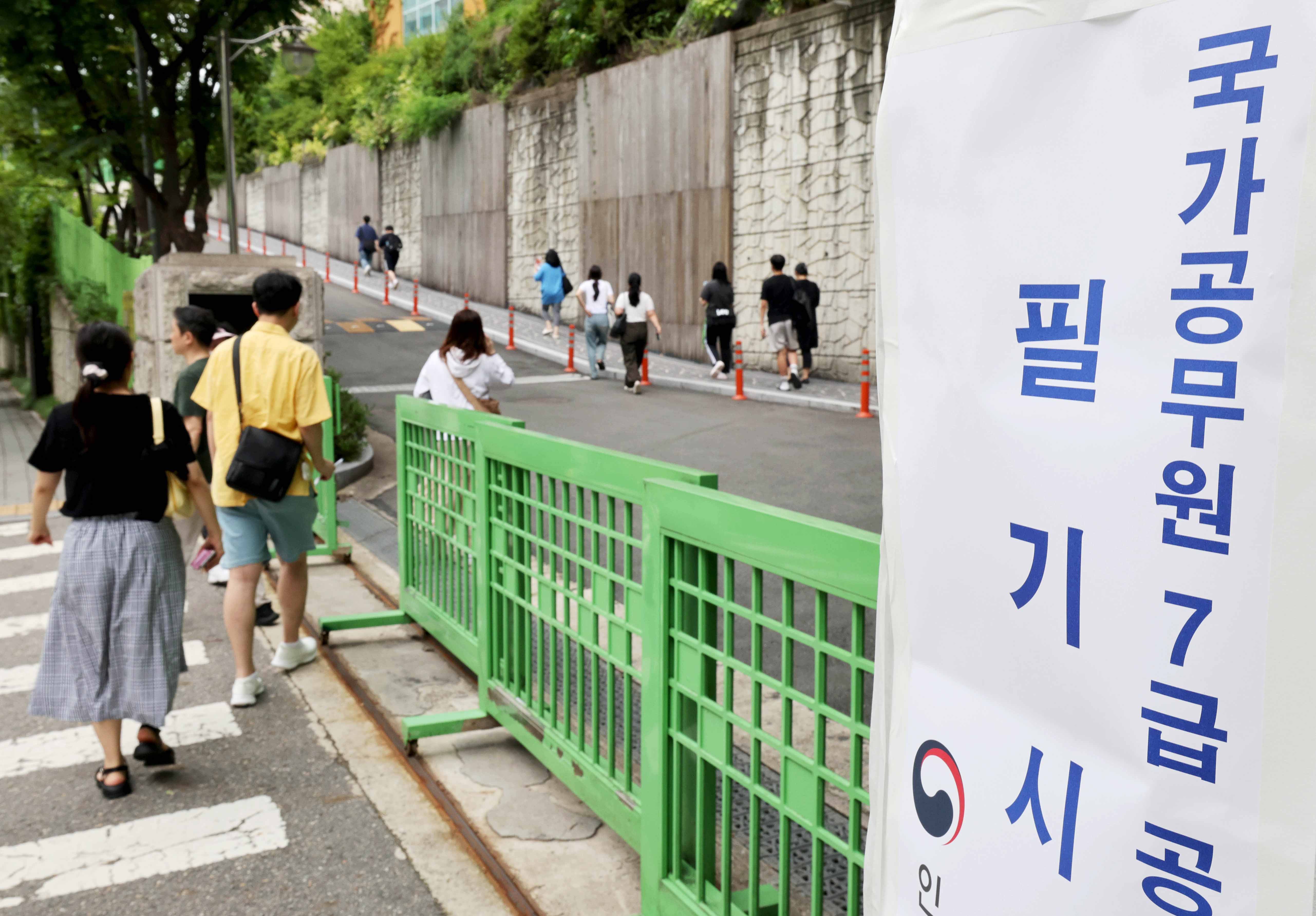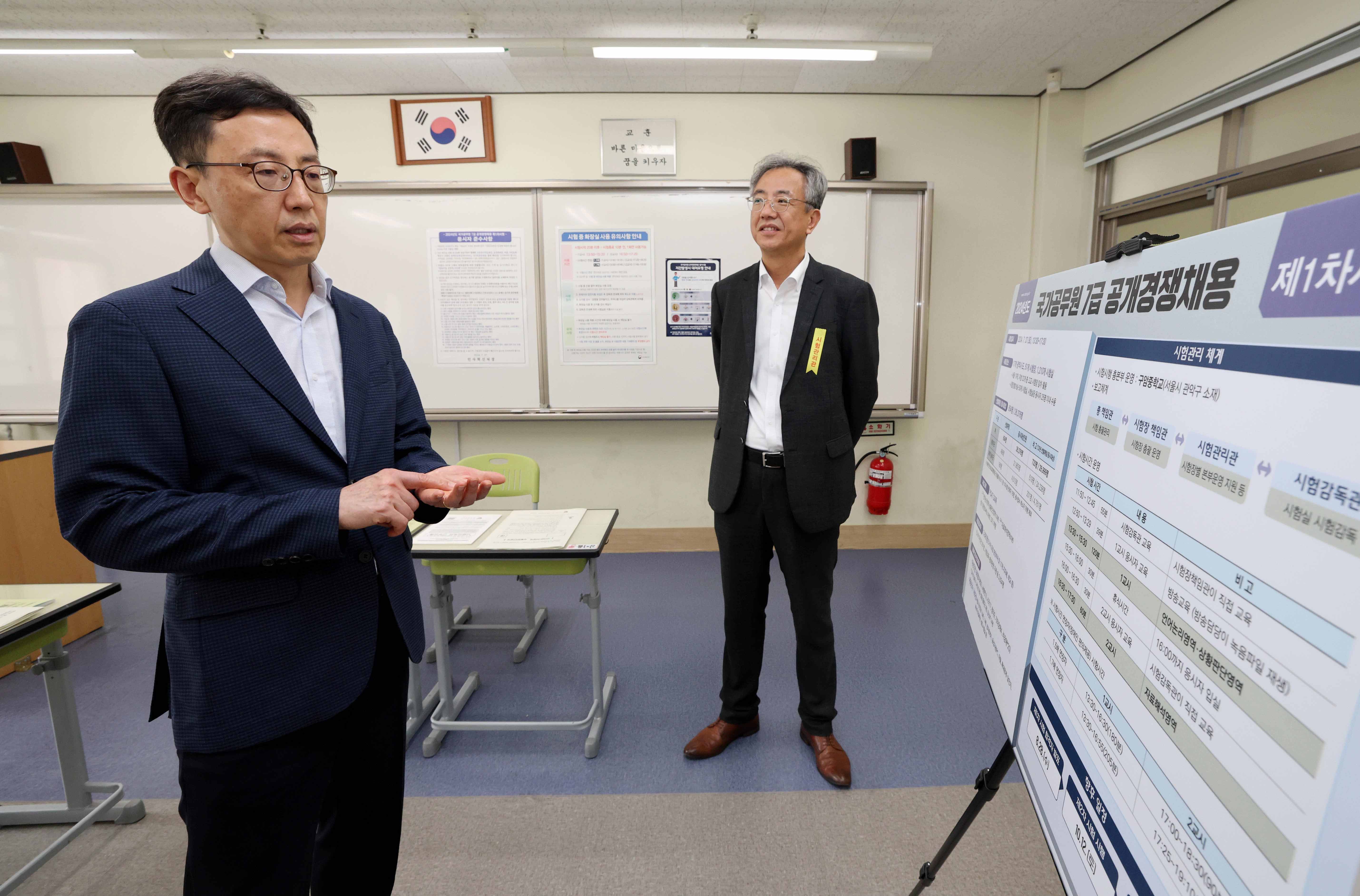 연원정 인사혁신처장이 7월27일 국가공무원 7급 공개경쟁채용 제1차 시험장인 서울 관악구 구암중학교를 찾아 시험 상황을 점검하고 있다.