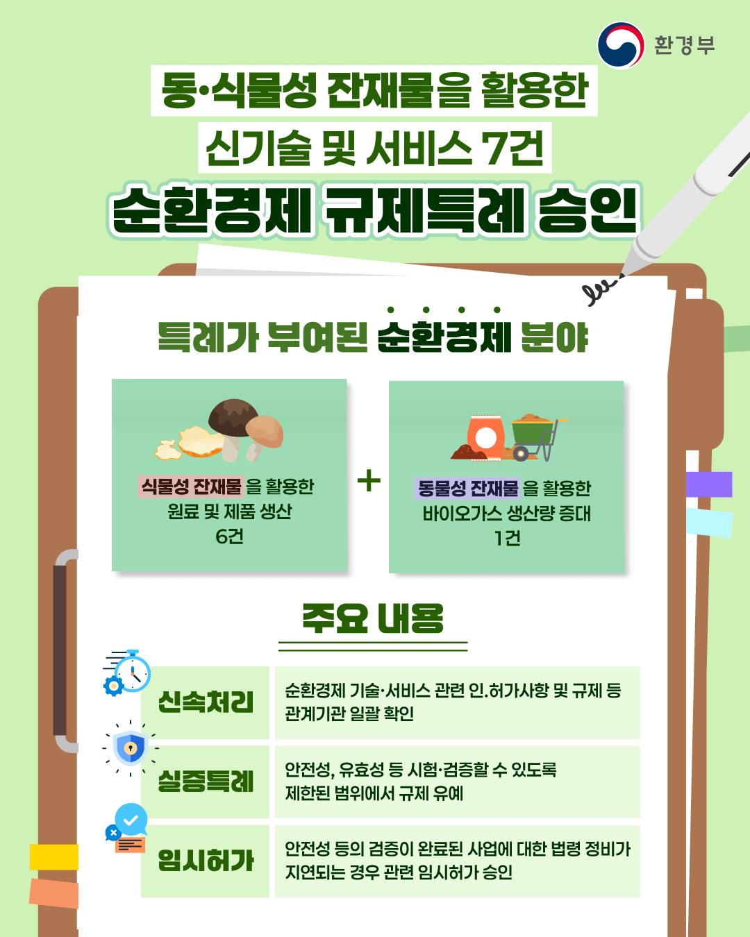 동식물성 잔재물을 활용한 신기숢 및 서비스 7건 순환경제 규제특례 승인