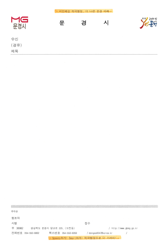 문경시는 온나라 전자문서 상/하단에 "적극행정 캠페인 문구"를 게재하여 적극행정 실천을 장려하고, 공직사회 내 적극행정 문화확산을 위해 노력하고 있습니다.