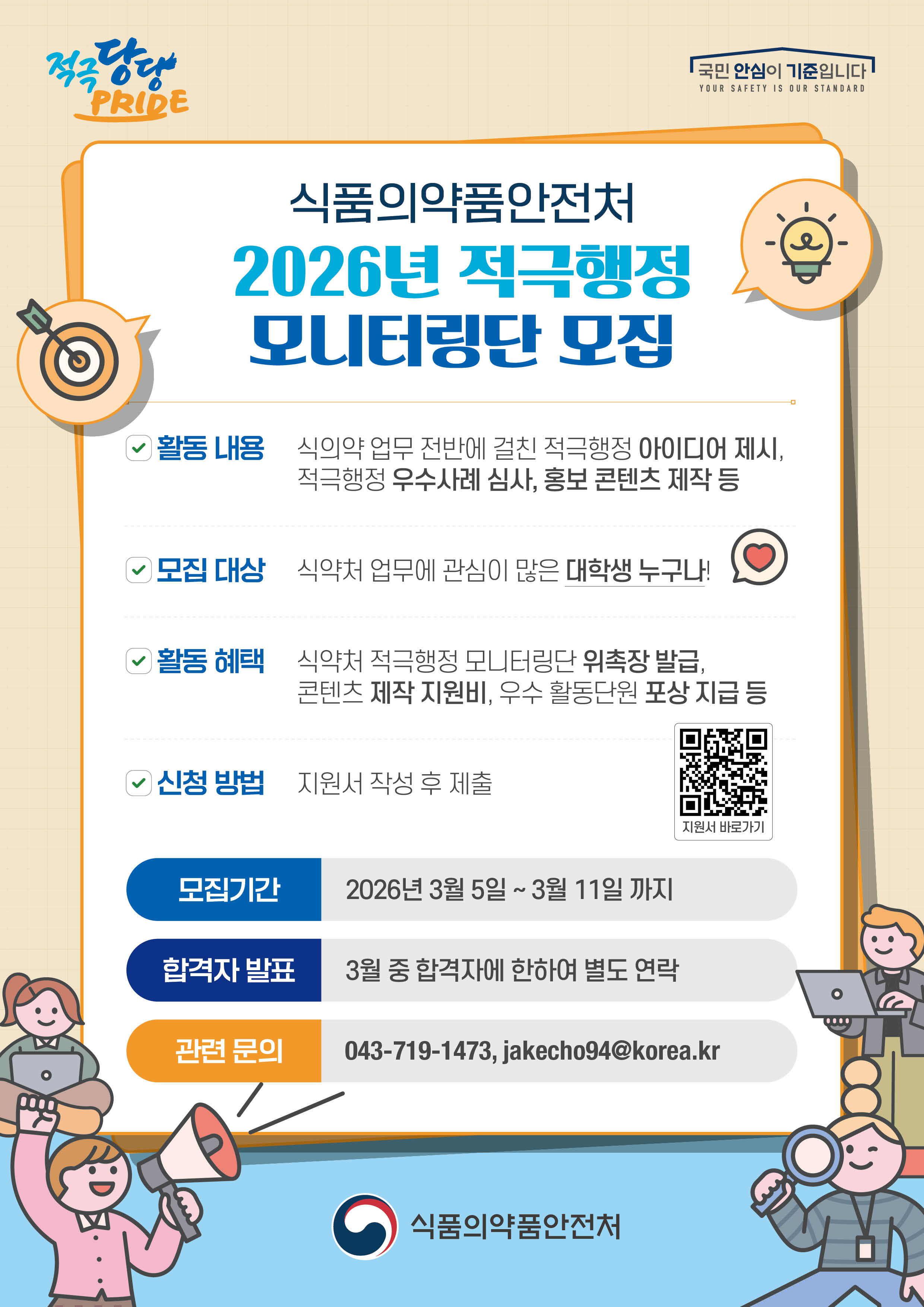 - 활동혜택 : 식약처 적극행정 모니터링단 위촉장 발급, 콘텐츠 제작 지원비, 우수활동단원 포상 지급 등
