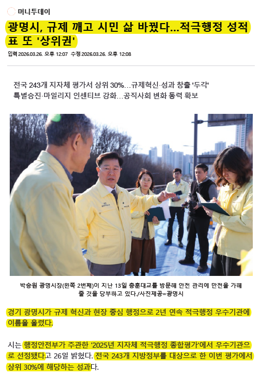 (경기도 광명시) 행정안전부 적극행정 종합평가 2년 연속 우수기관 선정
